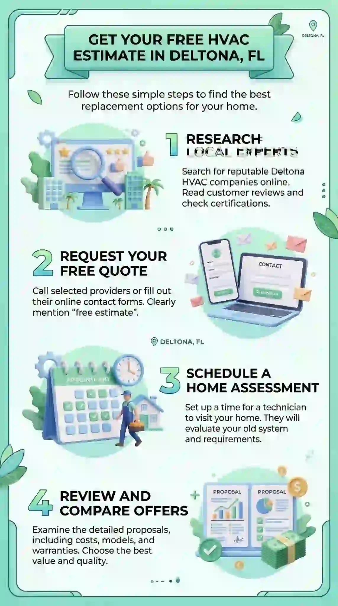 Start here: A free in-home estimate — including a Manual J load calculation — is the most important step in getting a replacement that actually performs in Deltona's heat and humidity.